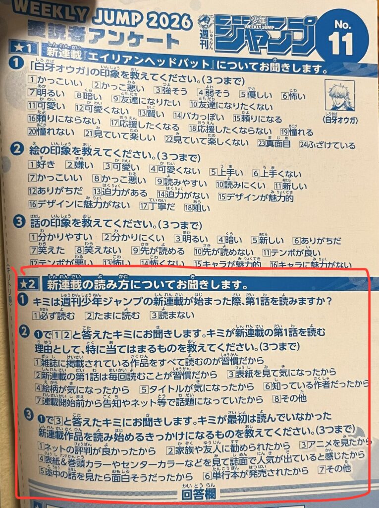 以下は週刊少年ジャンプ2026年11号の紙版のアンケの一面です。