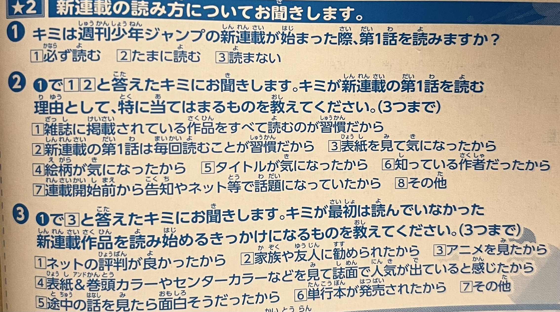 ①の質問で1⃣必ず読むと回答した読者は②の質問に答えることとなります。