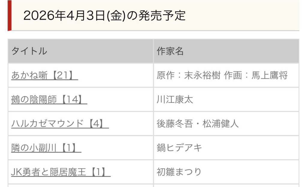 以下が2026年4月発売ジャンプコミックス新刊情報の本誌掲載作の抜粋です👇