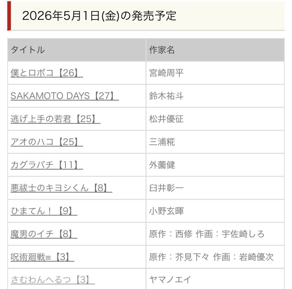 以下が2026年5月発売ジャンプコミックス新刊情報の本誌掲載作の抜粋です👇