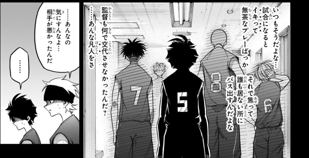 そして「いつもイキって無茶する」の部分ですが、その様子は進学先の練習試合で描かれており、このテンションでいつもイキってパスミスして試合後ネガってる選手がいたら、天才やら凡人やらを問う前に情緒に問題がありそうです。