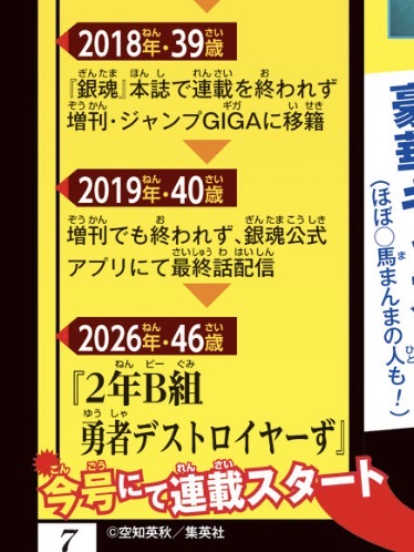 ただ、コメディのテイストである程度デストロイヤーずと差別化は図れそうとはいえ、やはり同期かつ同ジャンルに圧倒的ブランド力を持つ空知先生がいることが全く作品の進退に影響が無いとは思えないのでどう立ち回るかですよね…