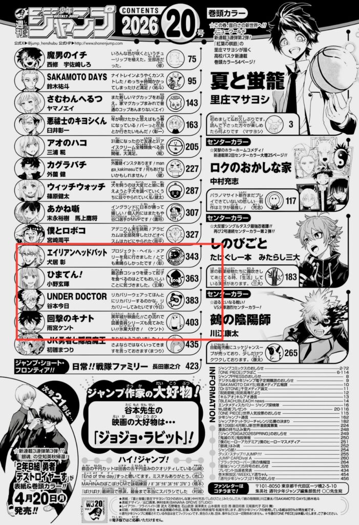まずは打ち切り候補はどの作品なのかという話ですが、これについては週刊少年ジャンプ2026年20号の掲載順が非常に分かりやすく示しています👇