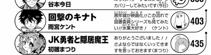 20号の掲載順では打ち切り済のJK勇者の1つ上であり、実質的に最下位。