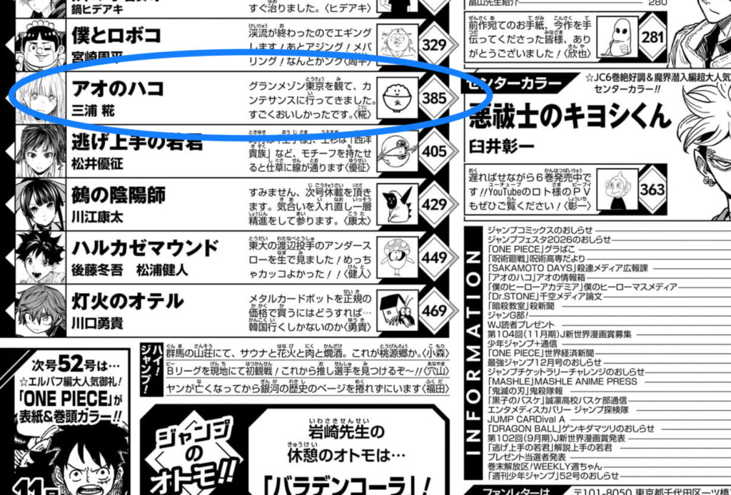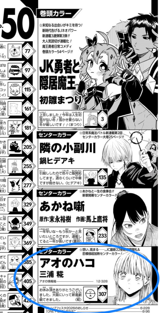 歴代ジャンプラブコメは終盤になると掲載順が下がる傾向がありますがアンケート最強のアオのハコとてその伝統からは逃れられないのかもしれませんね