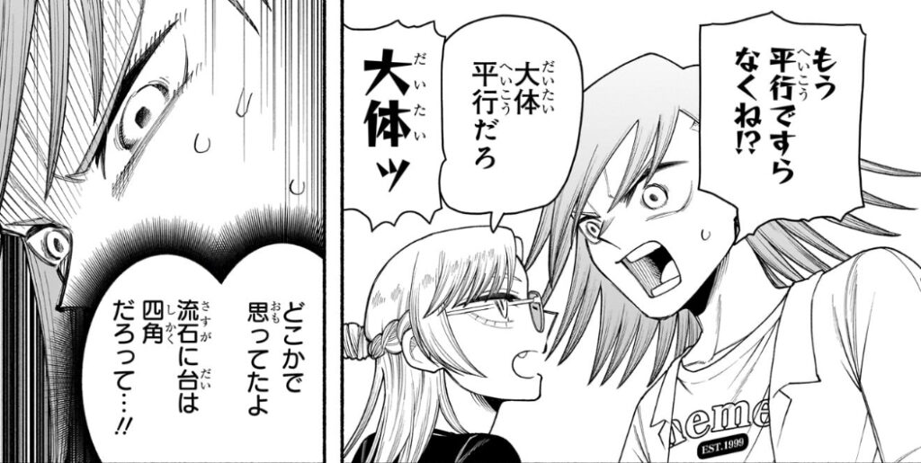というかその後は歯止めがきかなくなるかのように話が進み、並行でなくなった台でも試合が続いたり、ついには人の頭は大体平行という理論で試合条件を成立させることに。……せやろか
