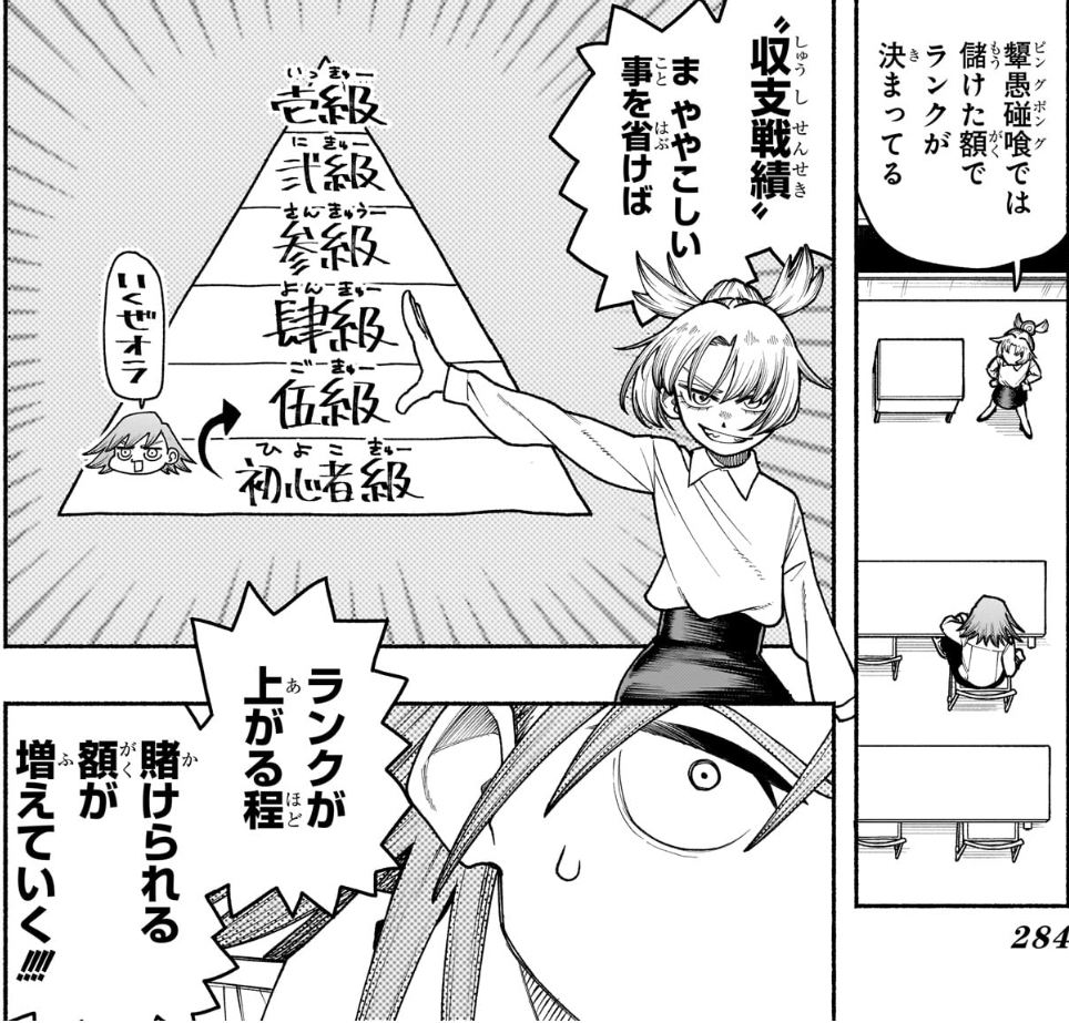 話をピングポングに戻すと、序盤はガムシャラに勝ち続けて100万ずつ獲得する様子が描かれるのですが、基本的にそれだけに終始しており