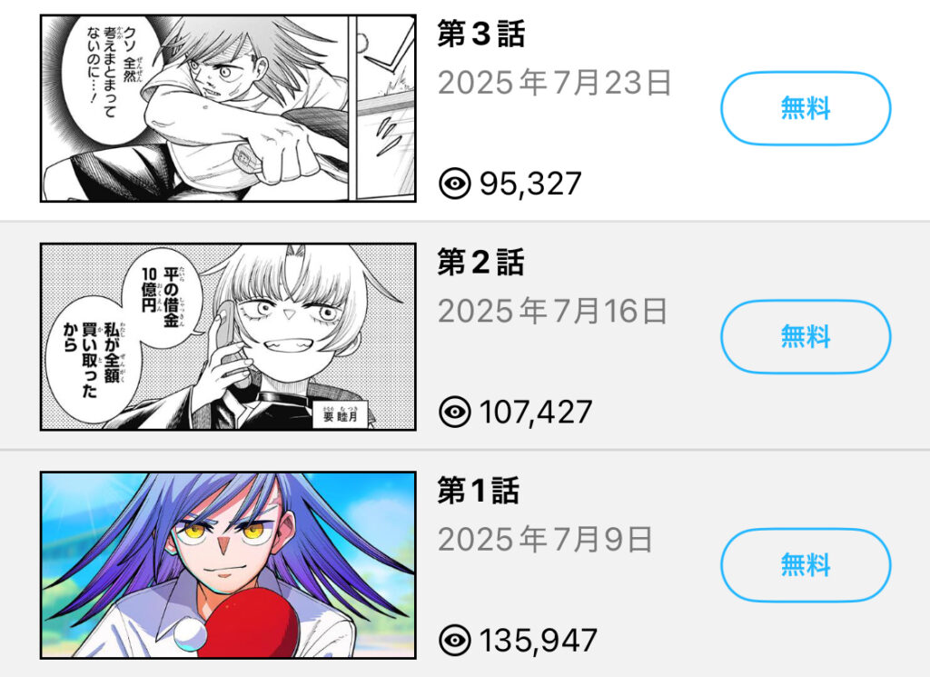 ということで作品の第一印象を映す鏡であるジャンプ+試し読みPVは、エキデンよりは高いものの大した差は無く、やはり読者の絶対数が少ない状態でのスタートであったのは間違いありません。