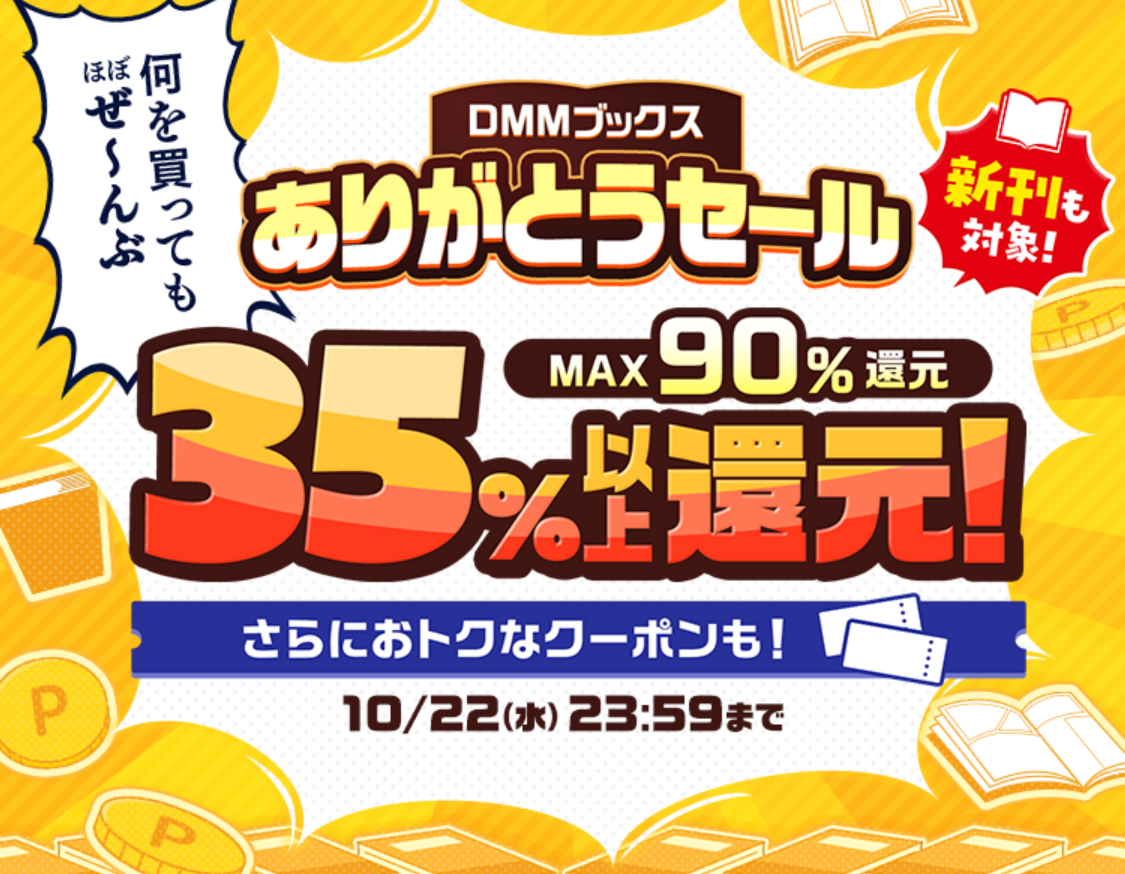DMMブックス「ありがとうセール」では、対象の電子コミックがほぼ全品35%以上還元、最大90%ポイント還元!