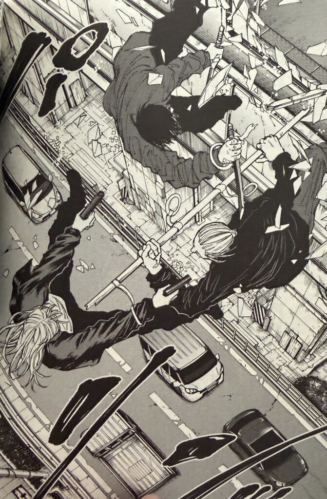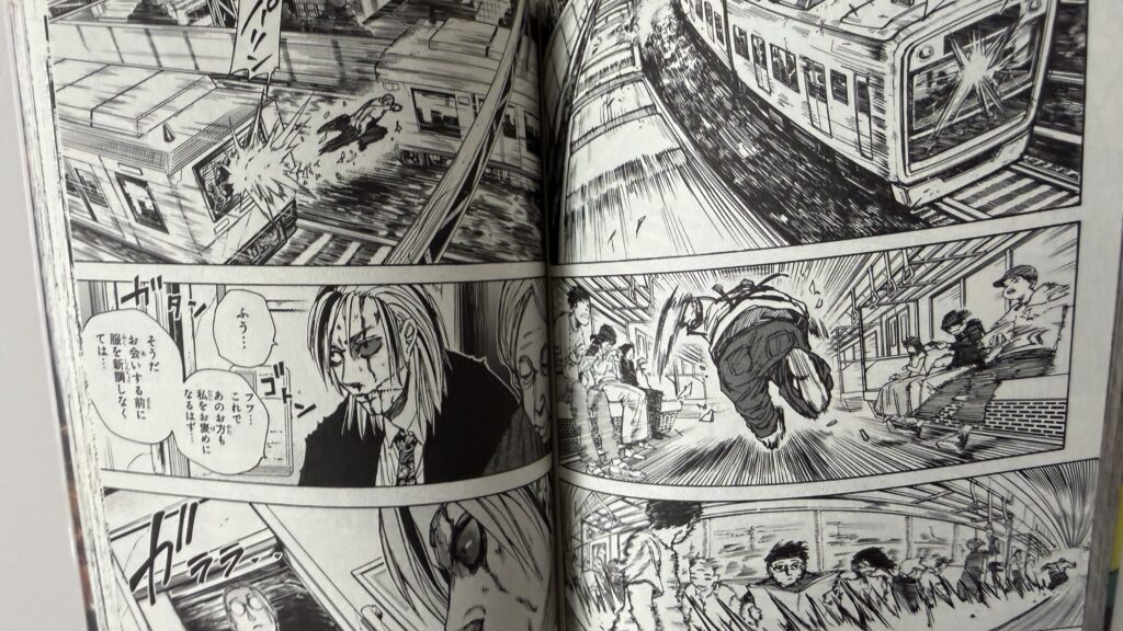 サカモトが吊り革を2人の手にかけて社外に放り出るシーンは「らしさ」に溢れてますが、このバトル自他、過去編の冒頭にチョロっと描かれただけであり、それが8位となると少々意外ではありました。