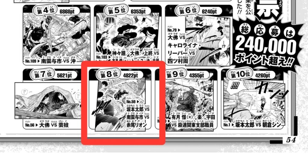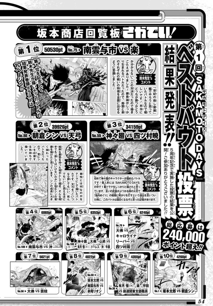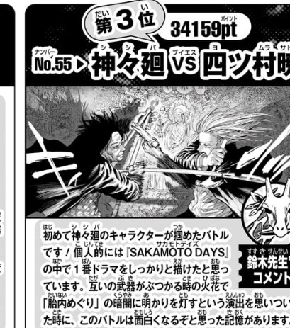 週刊少年ジャンプ22.23号でSAKAMOTO DAYSのベストバウト投票の結果が発表されました。(発売前にジャンプ公式youtubeで発表されてたので最速ではないですが)