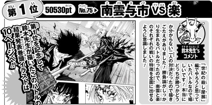 栄えある第1位は、世紀の殺し屋展編での南雲vs楽(50,530ポイント)