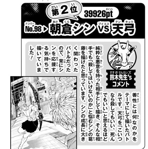 第2位は、殺連監獄潜入編のシンVS天弓(39,926ポイント)