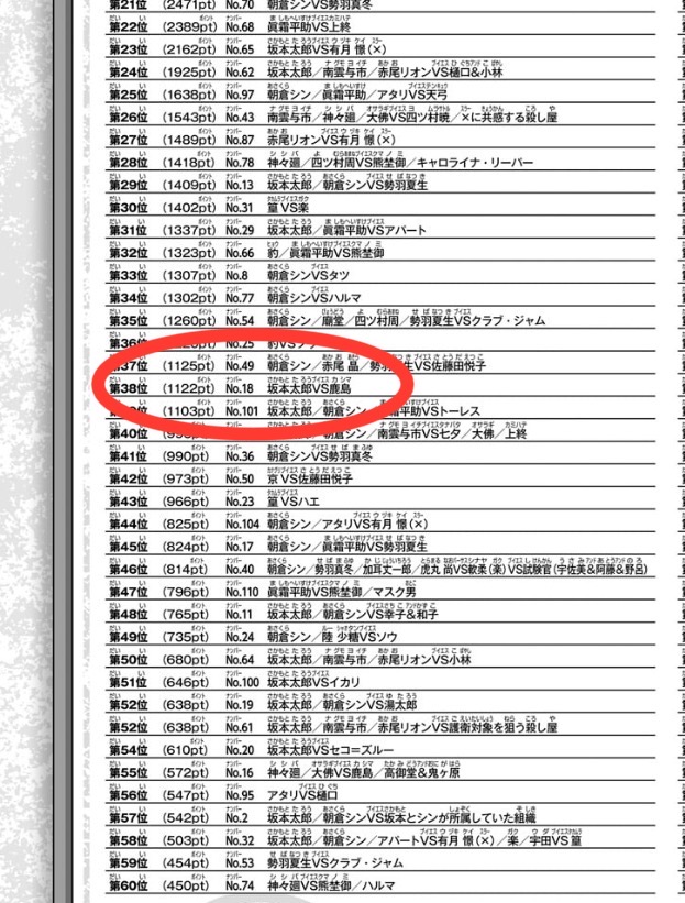 一方で低いなと感じたのは第38位の坂本VS鹿島(1,122ポイント)