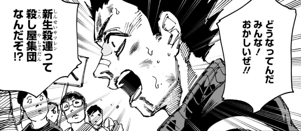 そして戦闘後には、スラーを支持する一般人を見て「どうなってんだみんな!おかしいぜ!!新生殺連って殺し屋集団なんだぞ!?」と発言。