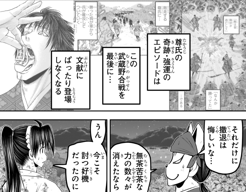 史実で尊氏が亡くなるまで作中では5年以上ありますし先週で決着ついたと見せかけて神力問題もまだ残っているので描こうと思えば春まで伸ばせそうで