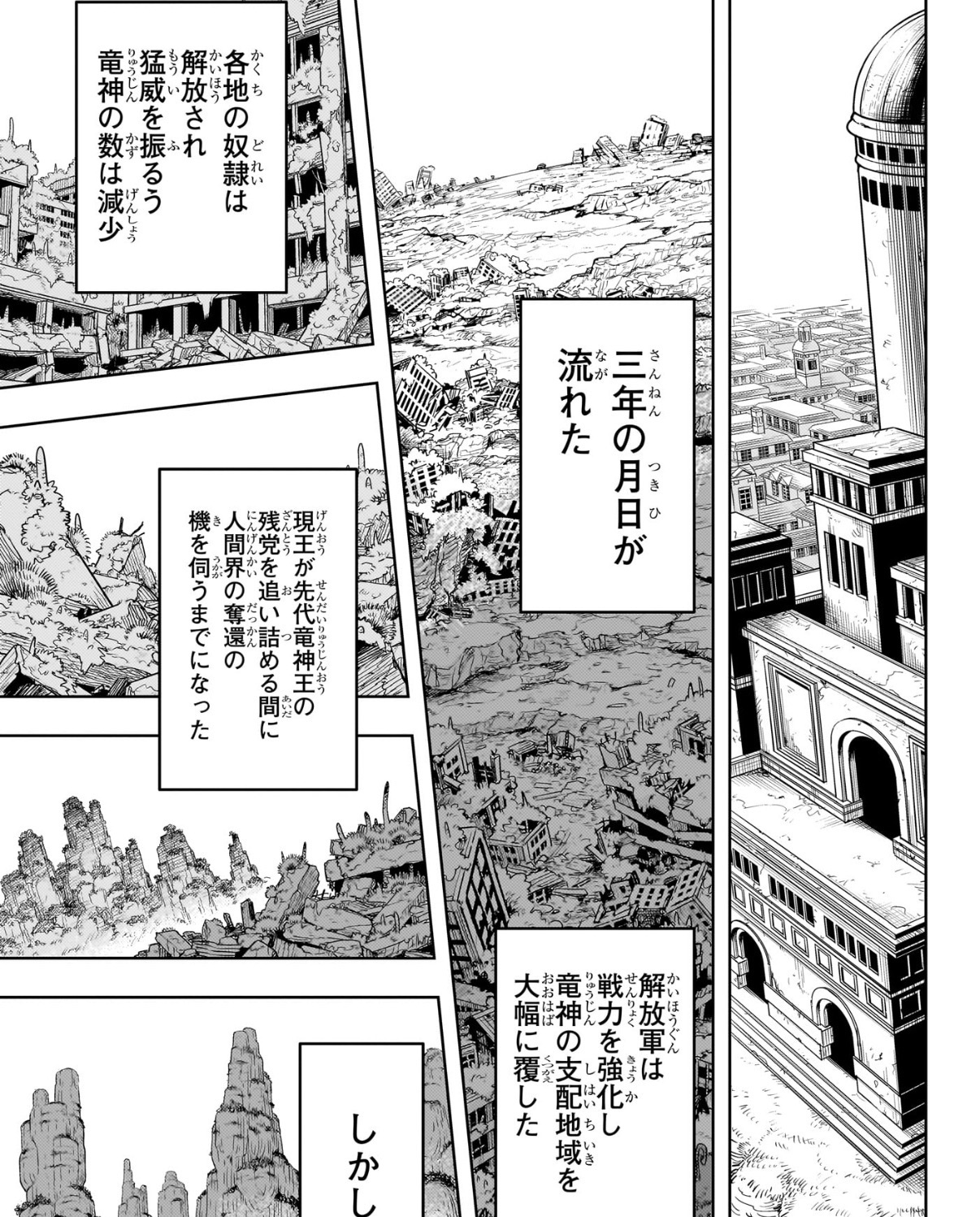 竜神の支配地域をゴッソリ取り返したこと、各地の奴隷は解放され竜神が減ったこと、人間界を奪還の期を伺うほど人類が優勢になったこと……ナレーションが過労死しそうなくらいの情報の激流です。