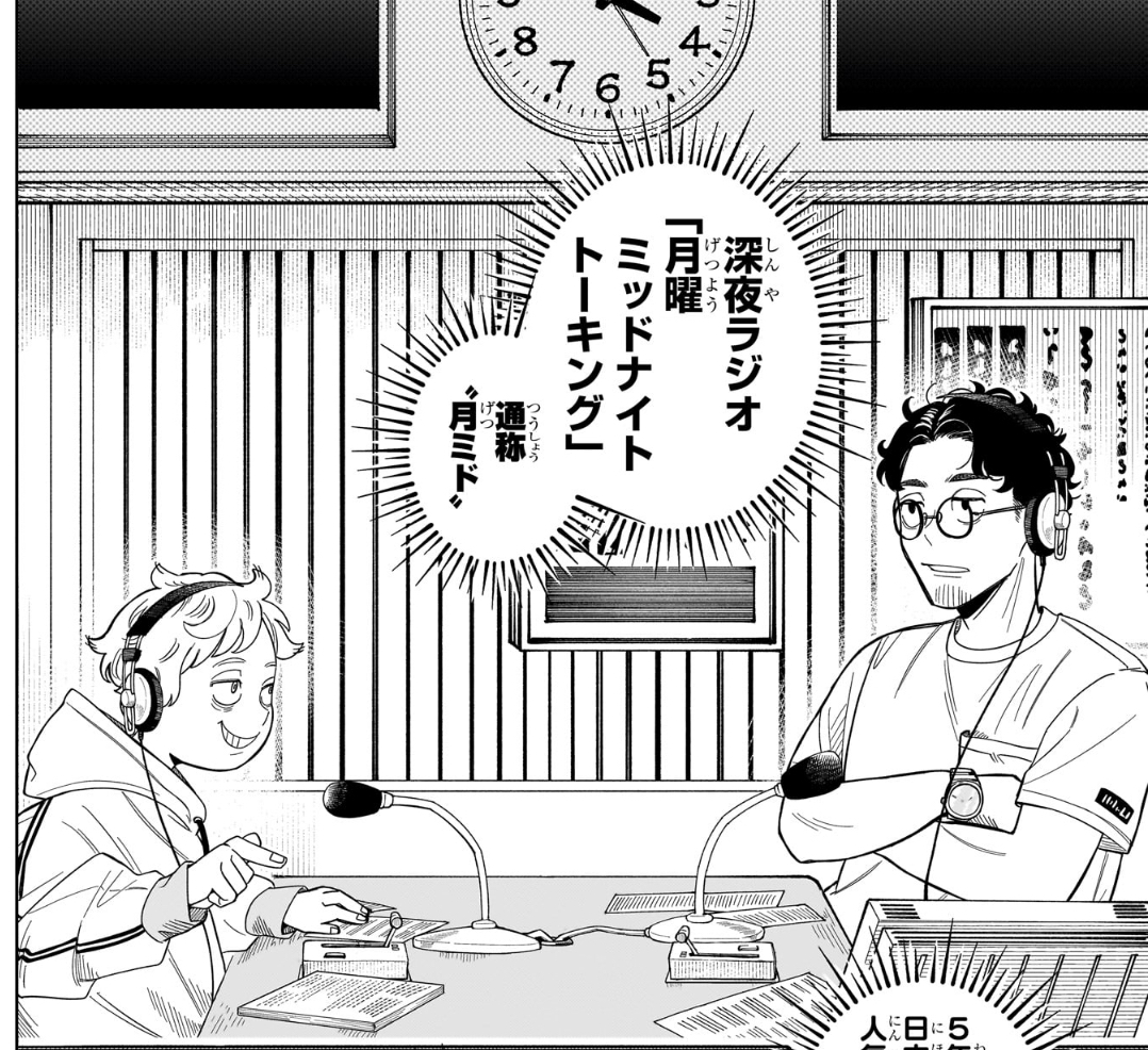 そんな人生論はどうでもいいのですが、一方の物語の縦軸を担うラジオ番組「月曜ミッドナイトトーキング」はというと名前の通り毎週月曜の放送であり、物語も番組で発表される大喜利をもとに進められます。